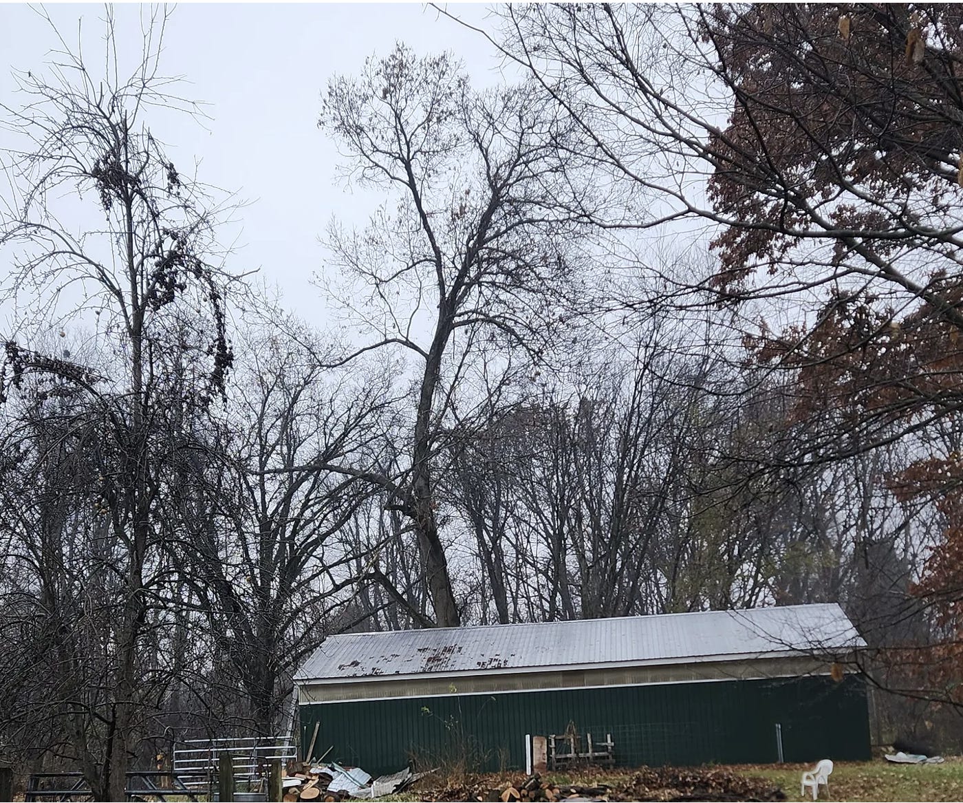 Several large branches of the tree are hanging over the barn, and the whole tree is canted slightly toward the barn, though its weight is leaning in two other directions because of the curve of the trunk. (Another person who considered dropping the tree for us wanted to drop it 180 degrees in the opposite direction of the first guy’s plan—this did not inspire confidence.)