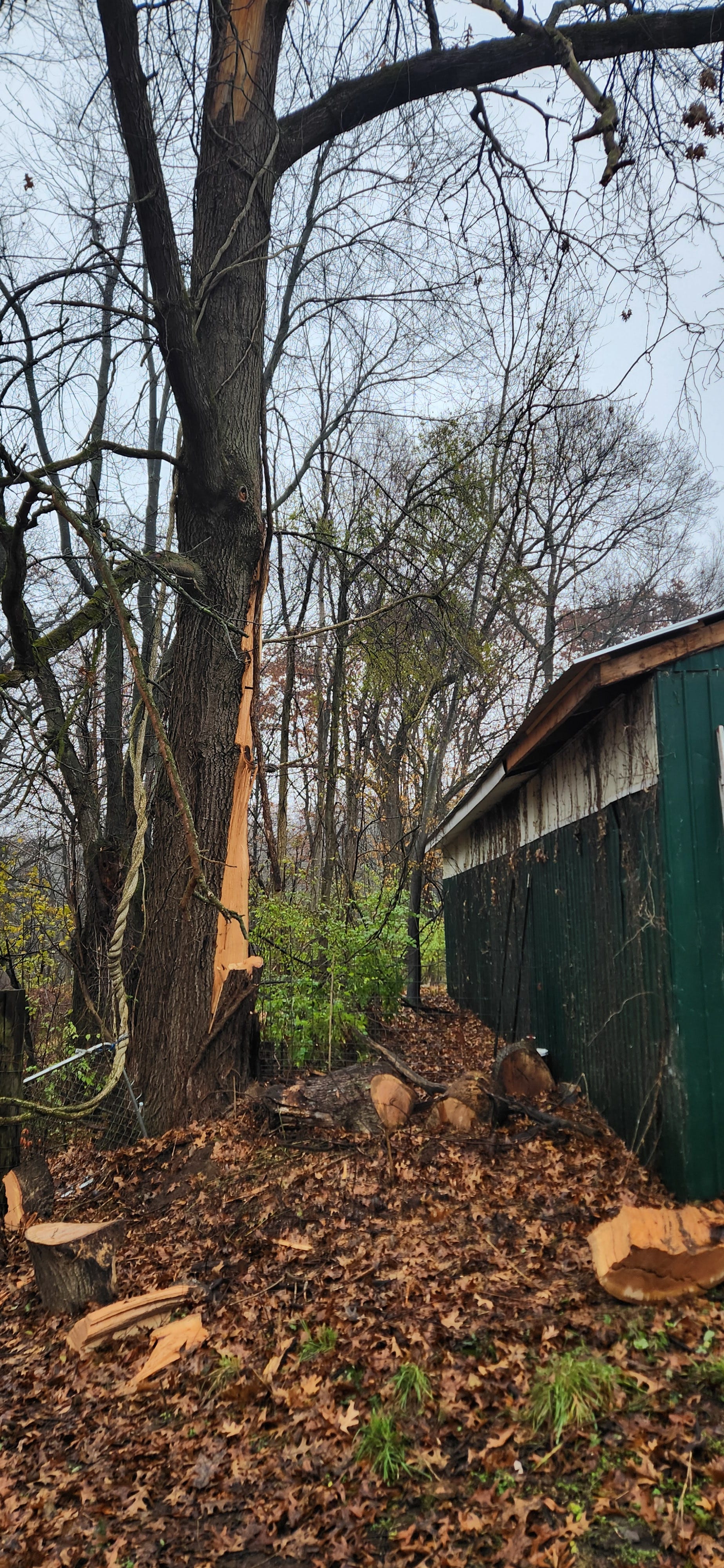 And there’s another big oak, maybe 100 foot tall, over our oil tank (containing about 750 gallons of furnace oil to get us through the winter.) Also, it is one of many trees that lean way over the house. If it fell, it would take out not only the oil tank but much of the house. It will be the next to go, at great expense.